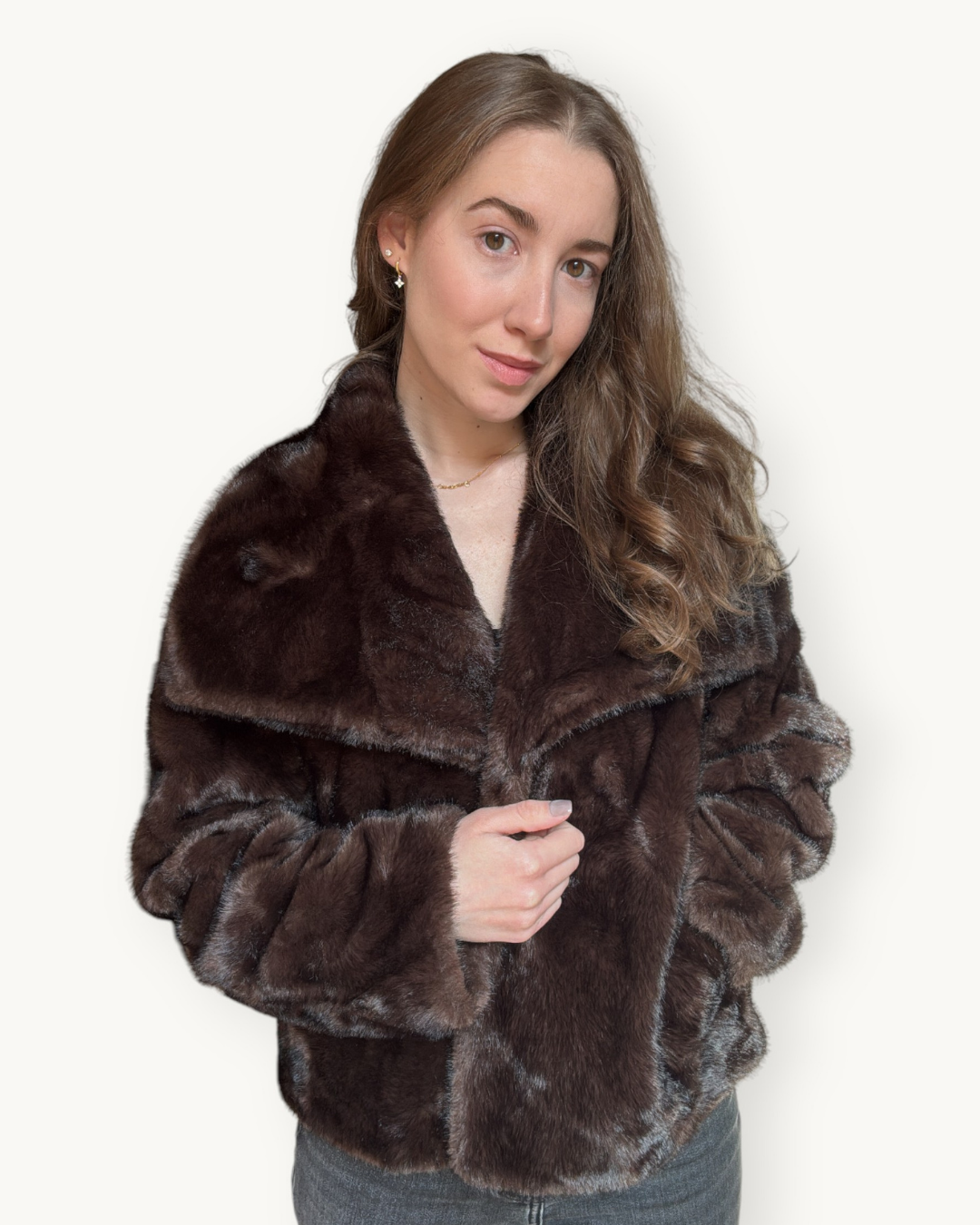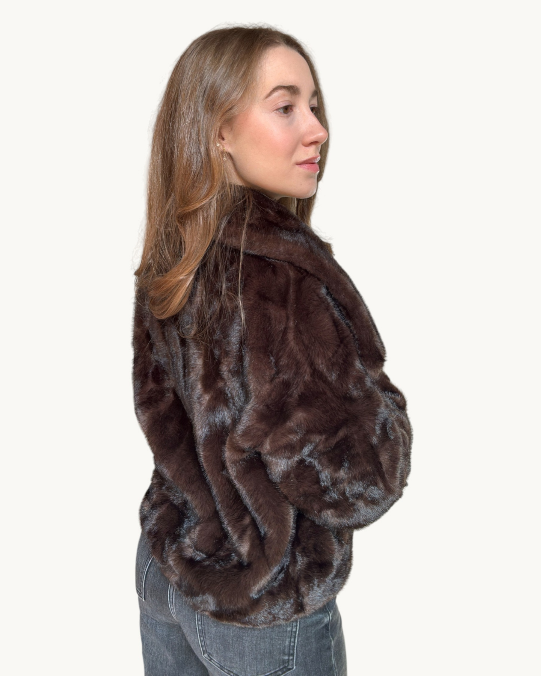 Este abrigo de pelo sintético en oscuro combina elegancia, suavidad y comodidad. Su textura extra suave al tacto y su acabado brillante aportan un toque lujoso ideal para los días fríos. El diseño corto y estructurado con cierre frontal de botones y bolsillos laterales lo convierte en una prenda versátil, perfecta para realzar cualquier look.