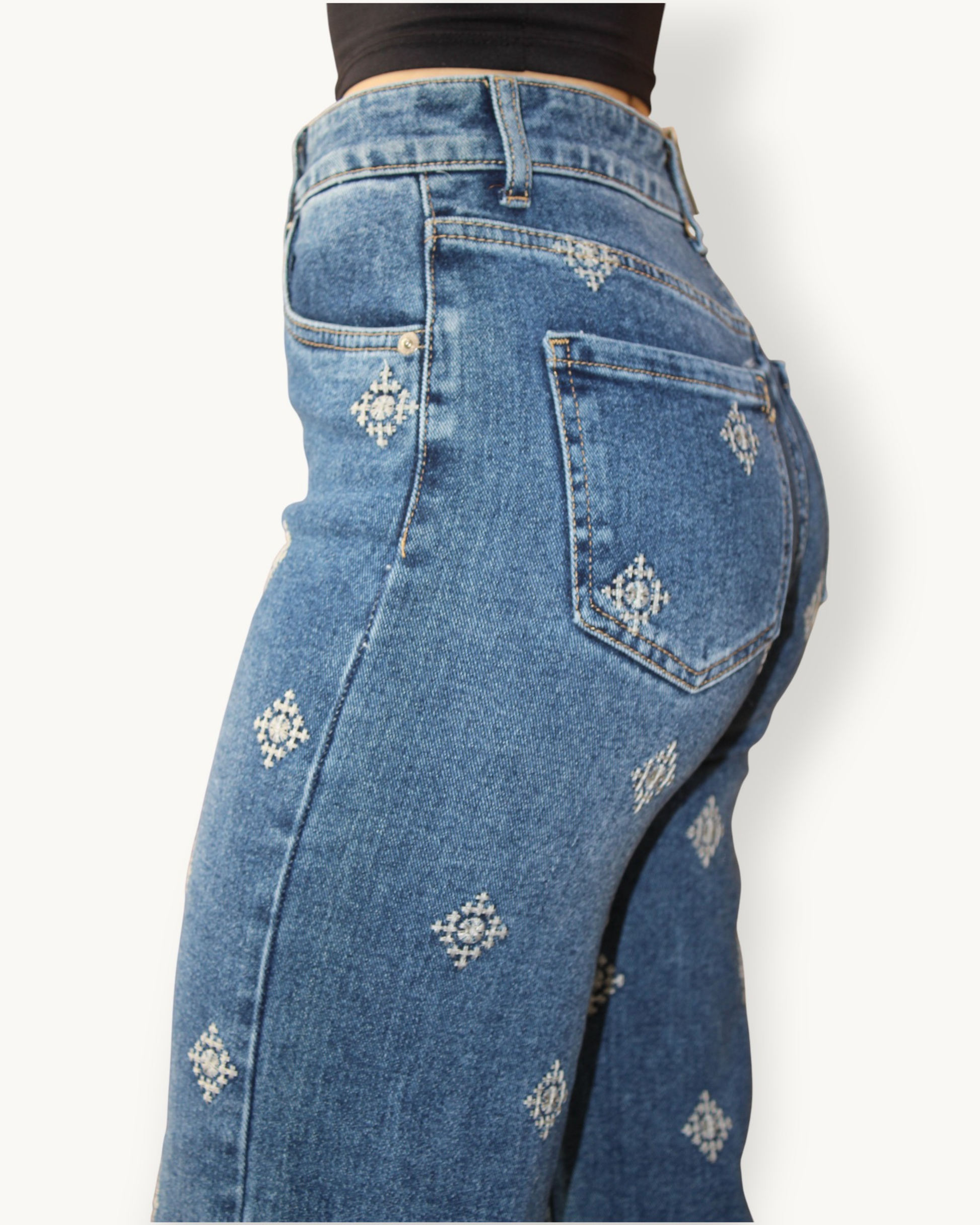Jeans tiro alto con corte ancho leg en color denim azul medio, con bordados geométricos. Su tejido se adapta perfectamente al cuerpo, mientras que el diseño moderno y los detalles bordados aportan un toque sofisticado y distintivo. Ten en cuenta que este modelo es ligeramente más corto de lo habitual.